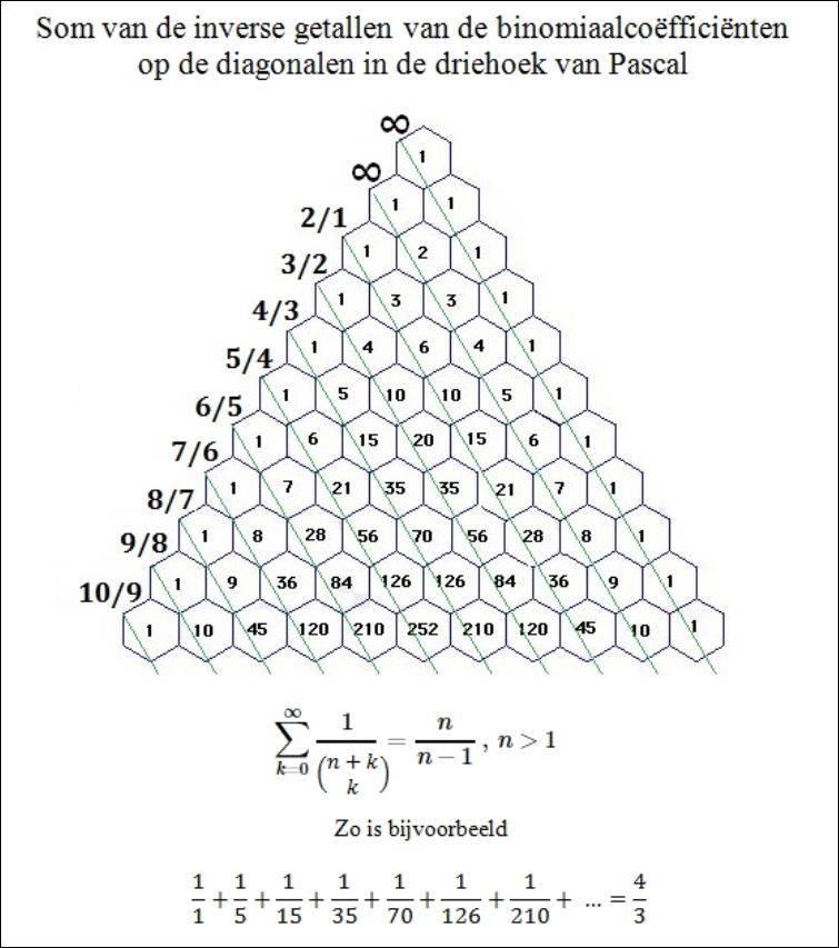 Als je de inverse getallen neemt van de binomiaalcoëfficiënten op de tweede diagonaal (van boven te beginnen)